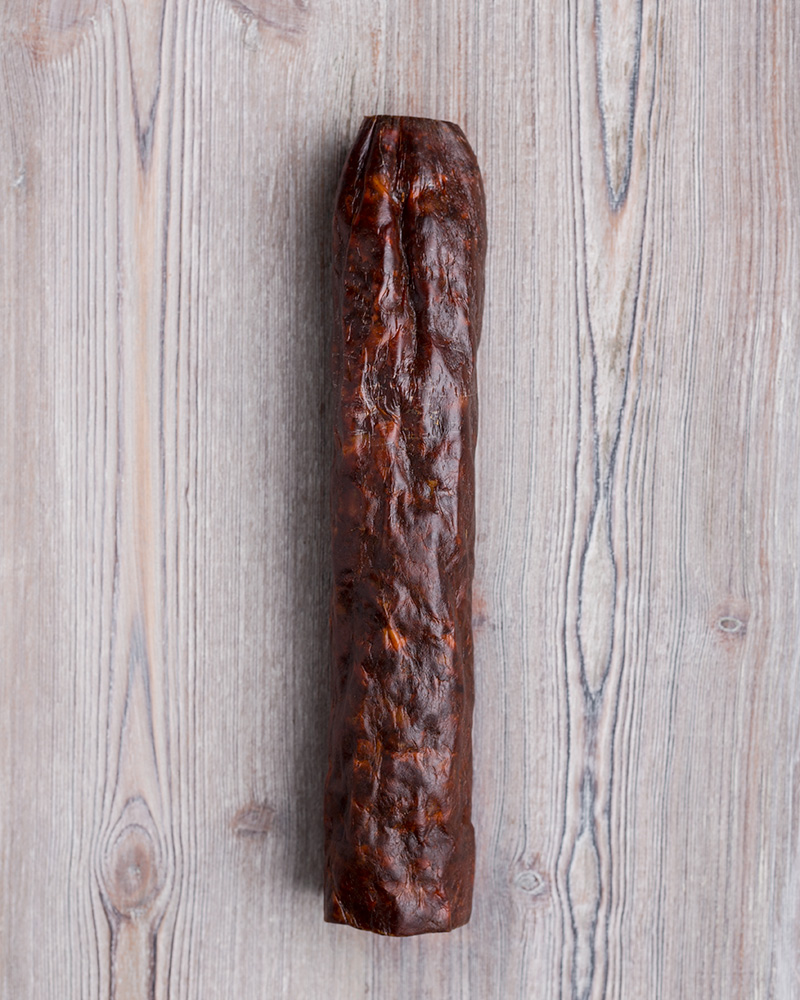 Chorizo de León ahumado con leña de roble, con reconocimiento de la Asociación de Artesanos Alimentarios de Castilla y León y el sello de Tierra de Sabor. Tiene un sabor intenso pero enriquecido por los matices especiales del ahumado a la leña. Auténtico chorizo artesano de pueblo. Curado de manera natural con el aire de la Sierra. Un verdadero chorizo de León.
