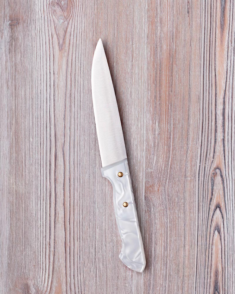 Tradición y modernidad en este dúo de tabla de mármol y cuchillo de nácar.